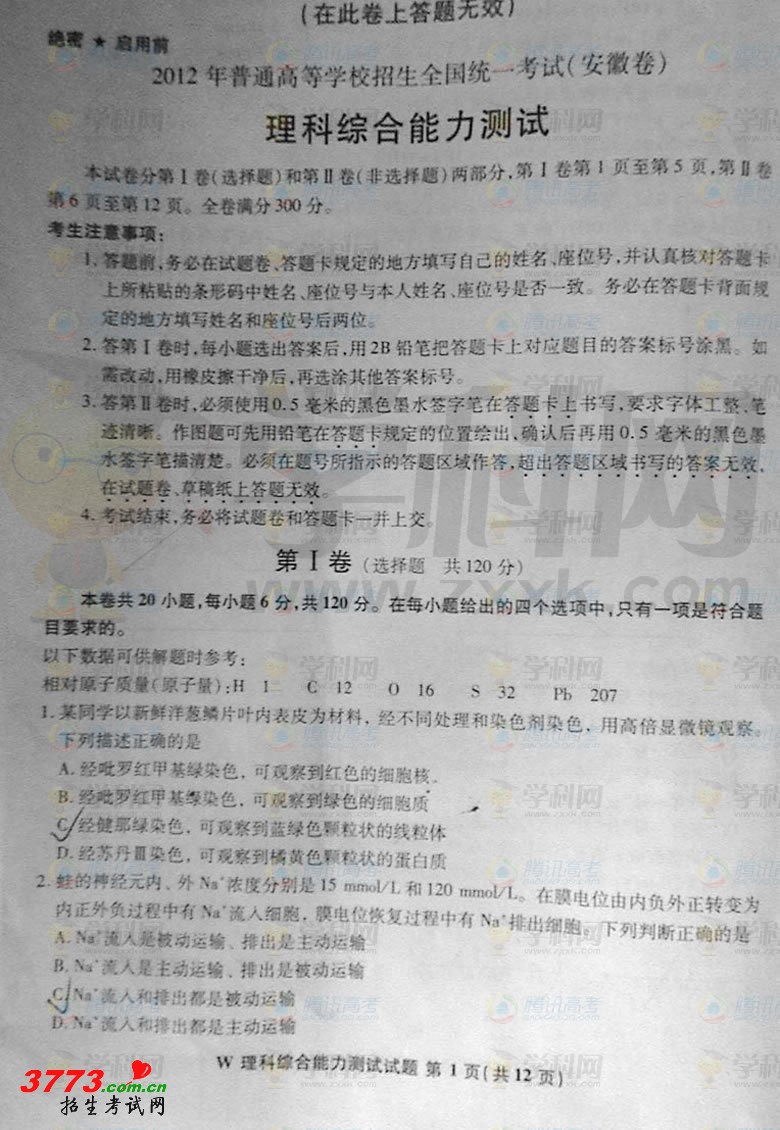 [组图]2012安徽高考理综卷试题及答案(理科综合)