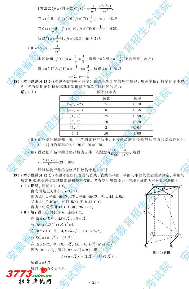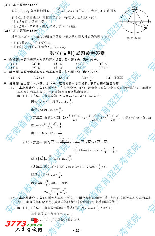 [组图]2012年安徽省普通高等学校招生统一考试试题答案(文科数学)