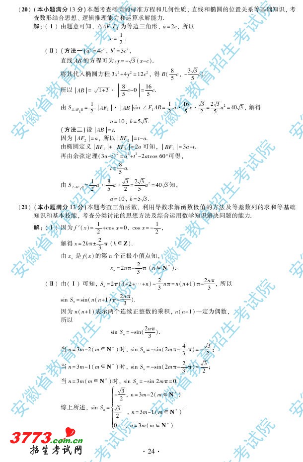 [组图]2012年安徽省普通高等学校招生统一考试试题答案(文科数学)