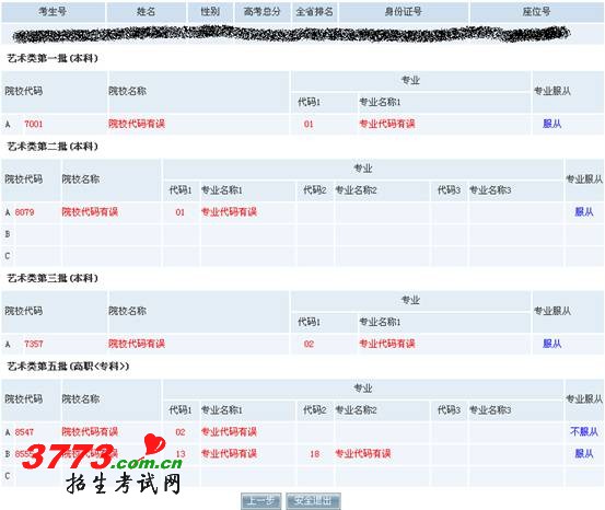 若考生志愿信息填报不合法,系统将以红色字体予以提示,且志愿信息无法提交,考生须点击“上一步”回到志愿填报界面进行修改,修改完毕再次进入志愿校对页面。
