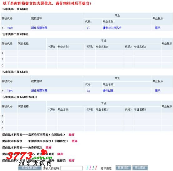 请考生务必再次仔细核对自己的信息,确认无误后输入校验码并点击“信息提交”按钮提交志愿信息,信息一旦提交将无法重填或修改,请慎重操作。