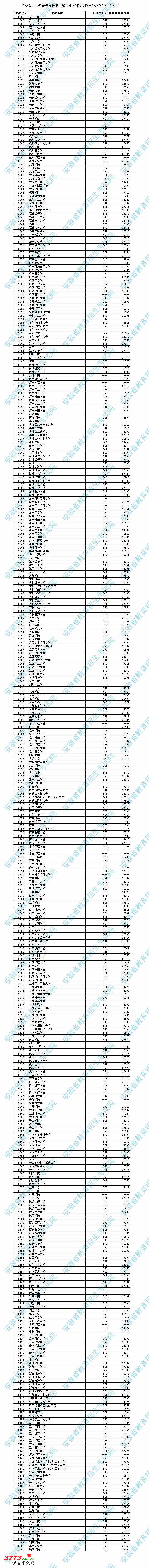 安徽省2012年普通高校招生第二批本科院校投档分数及名次(文史)