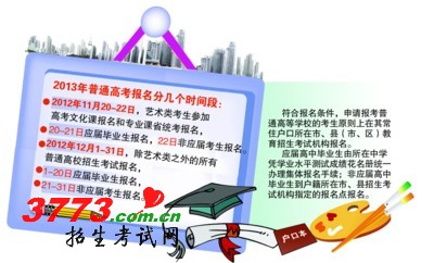 2013年普通高考报名分几个时间段:2012年11月20~22日,艺术类考生参加高考文化课报名和专业课省统考报名,其中,20~21日应届毕业生报名,22日非应届考生报名。