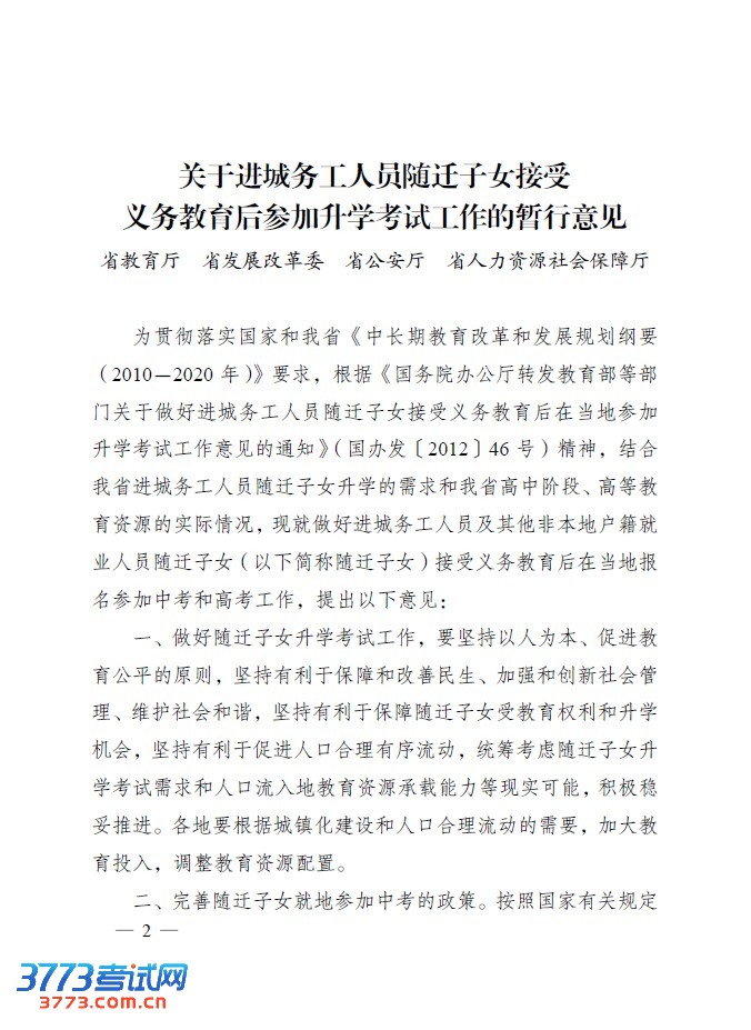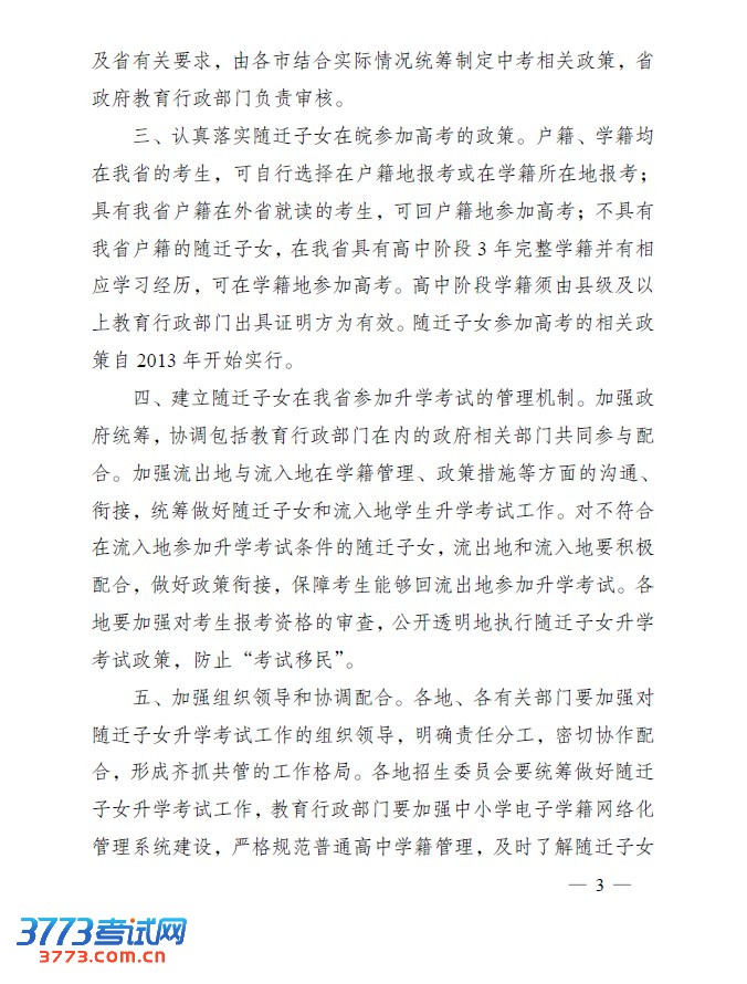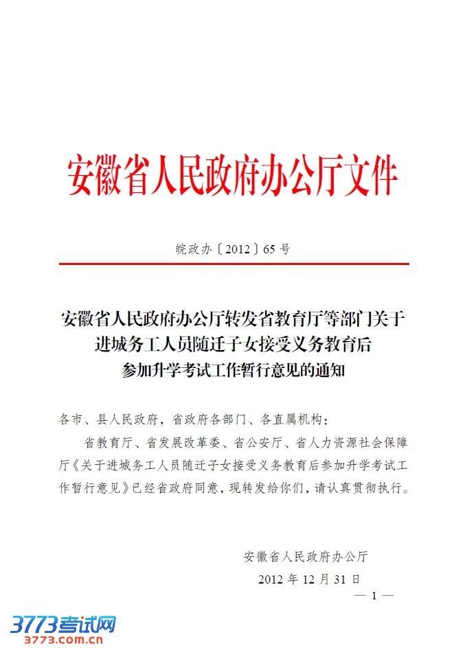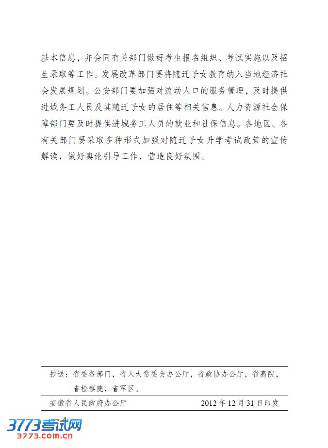安徽省人民政府办公厅转发省教育厅等部门关于进城务工人员随迁子女接受义务教育后参加升学考试工作暂行意见的通知