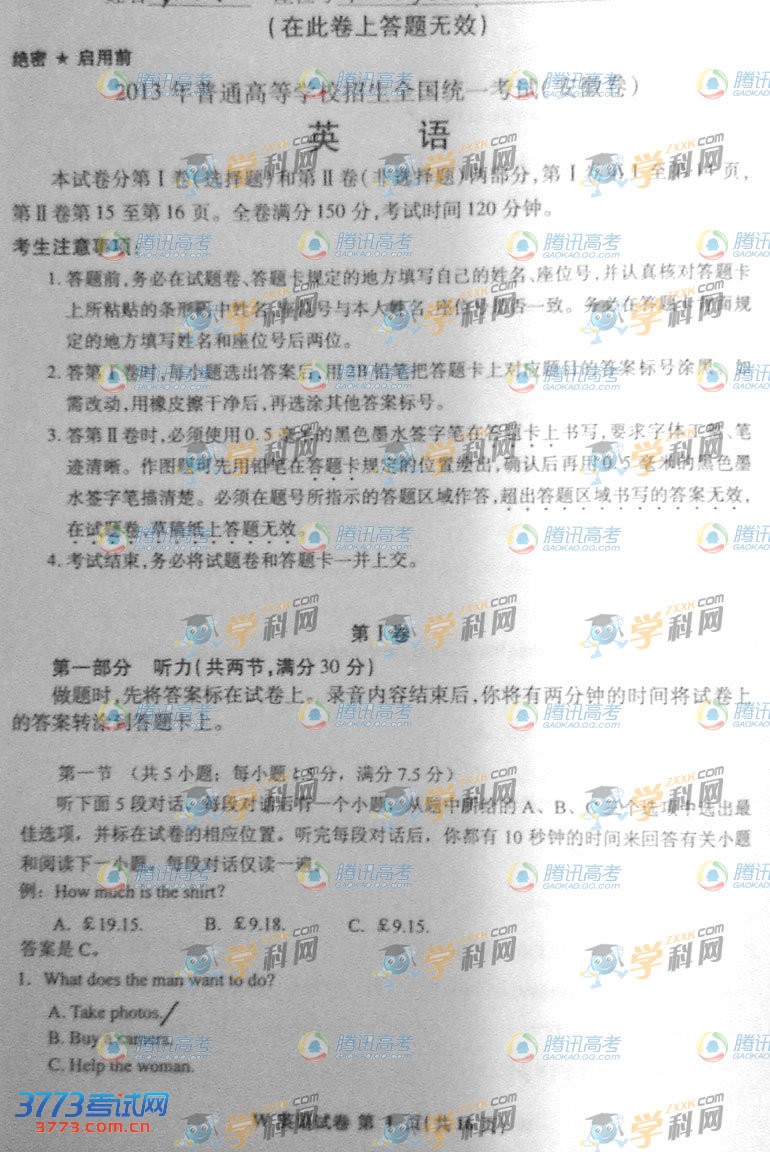 [组图]2013安徽高考英语试题及答案(参考)
