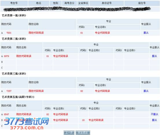 若考生志愿信息填报不合法,系统将以红色字体予以提示,且志愿信息无法提交,考生须点击“上一步”回到志愿填报界面进行修改,修改完毕再次进入志愿校对页面。