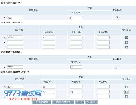 4.考生点击所要填报的批次进入志愿填报页面,根据《志愿预填表》输入所要填报的院校代码和专业代码,院校代码为4位数字,专业代码为2位数字。如果服从该院校专业调剂,请在相应院校“专业服从”框中打“√”。