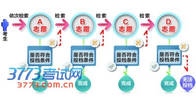 第二步,投档时按照排序逐个对考生的平行志愿进行检索,一旦出现符合投档条件的院校,即向该院校投档(如图所示)。