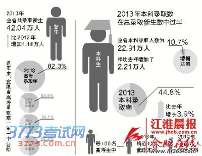 晨报讯 记者 王靓 9月份,全省将有42.04万新生踏入大学校门,比去年增加了1.14万人。昨天,安徽省2013年高校招生录取工作全部结束,据省考试院统计,今年的高考录取率达到82.3%,继2012年后再度“破八”。