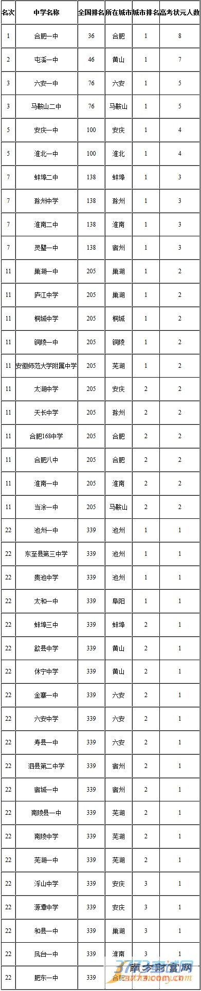 2015年安徽省高考盛产状元中学排名如下: