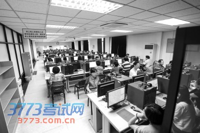 6月15日,高考语文阅卷点向媒体开放了位于北大计算机中心的三楼作文阅卷机房。今年评卷场所全部实行封闭管理,楼道口由武警把守,还首设安检门和手持扫描仪设备。记者看到,机房内,阅卷老师们的电脑屏幕上,左侧显示着扫描后的学生作文,右侧则是评分标准及样卷等,方便进行对比。