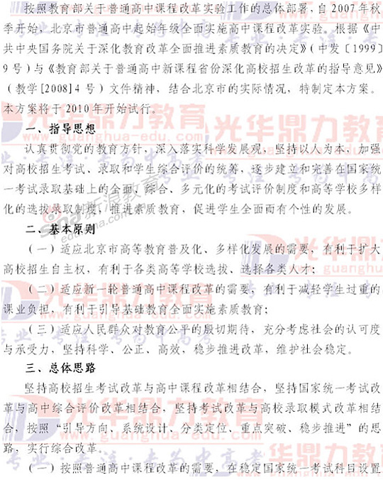 2010年北京市普通高等学校招生考试改革方案今日(10月9日)公布。按新方案要求,2010年北京市高考本科层次继续实行“3+文科、理科综合”的科目设置,卷面总分值仍为750分,各科目考试时间不变。新高考方案中,高职招生变化较大,招生形式将有自主招生、单考单招和高会统招三种。高中会考成绩和综合素质评价将分别以等级和统一表格的形式记入考生电子档案,在统招录取、自主招生中作为高校录取的重要依据。以下为方案原文: