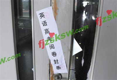 图为大楼内阅卷地点的门上已经贴上了封条摄/记者 柴程