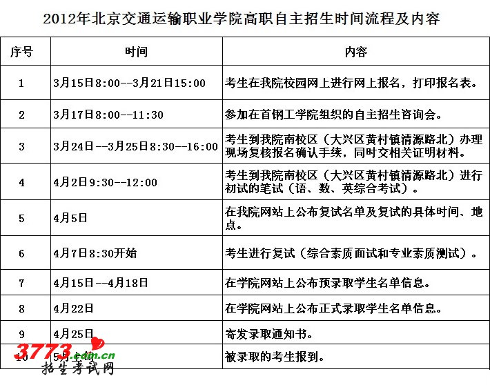 [图文]2012年北京交通运输职业学院高职自主招生时间流程及内容