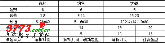 2012年北京高考延续8+6+6的试卷结构,即8道选择、6道填空、6道大题的形式,所占分值分别为40分、30分、80分。试卷由容易题、中等难度题、难题组成,并以中等难度题为主,总体难度适当。在此,学而思高考研究中心为高考试卷做一个简单的分析,如下表:
