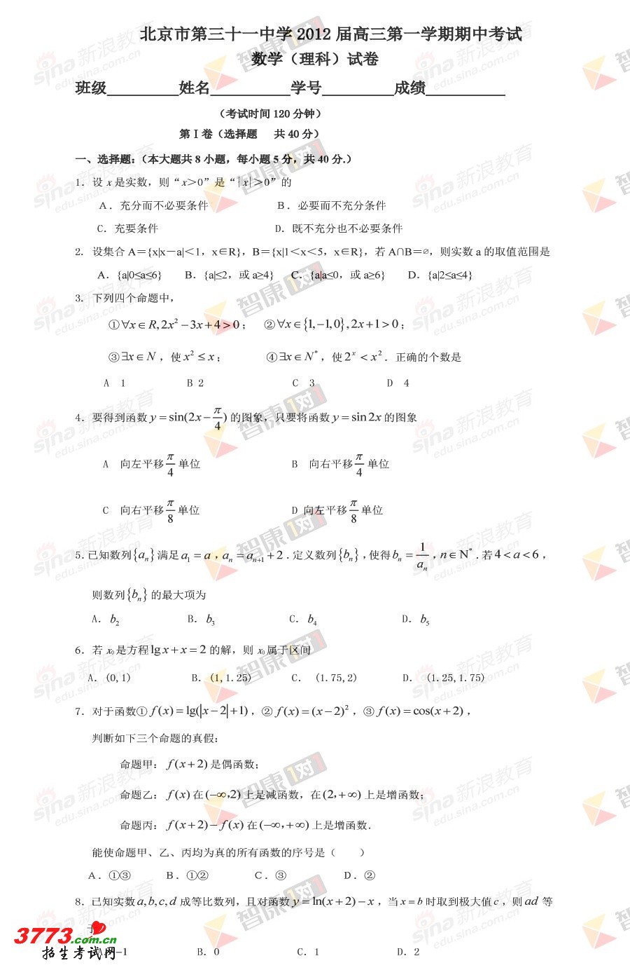 [组图]北京三十一中2012高三上学期期中考试理科数学试题答案