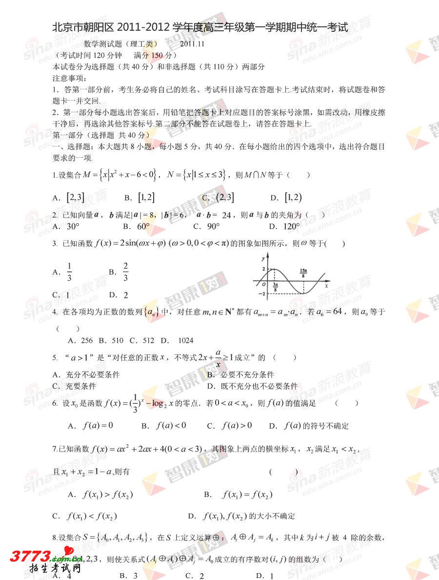 [组图]北京市朝阳区2012年高三上学期期中考试理科数学试卷答案