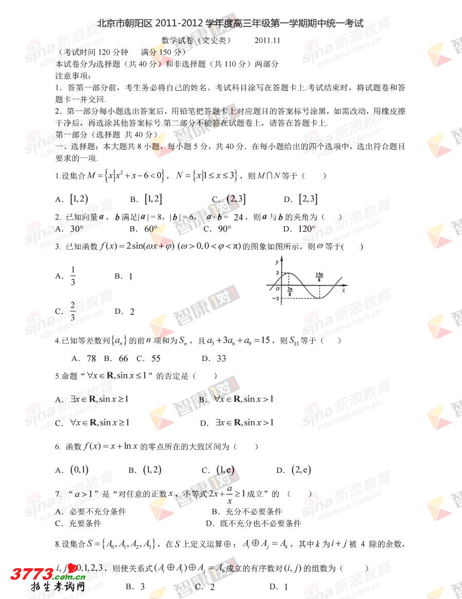 [组图]北京市朝阳区2012年高三期中考试文科数学试卷答案