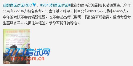北京教育考试院副院长臧铁军表示2013年北京高考有72736人报名高考,与去年基本持平,其中文科20913人,理科46455人,今年的考试不会有偏题怪题,也不会超出考试说明,将配合素质教育,重点考察考生基础水平。根据往年经验,录取率将保持稳定。