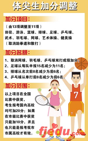同时,我市对享受体尖生加分的市级比赛项目进行了调整,从2009年起享受体尖加分的市级比赛由13项调整至11项,并减少了这些运动项目加分名额。