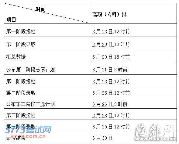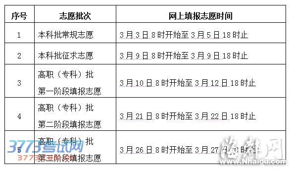 今年我省高职招考各类别志愿全部由考生在网上填报,不进行现场确认。考生网上填报的志愿是投档录取的唯一依据,考生应在规定时间内自行上网填报志愿,志愿填报时间截止后,网上填报志愿系统将自动关闭。各批次考生网上填报志愿的时间安排如下: