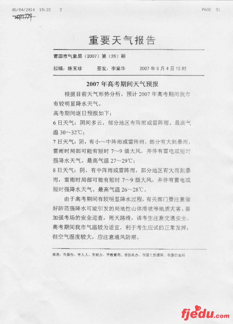 [图文]2007年高考期间莆田市天气预报