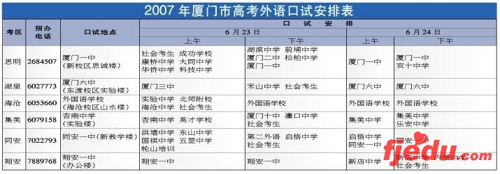 今年我市高考外语口语考试时间是6月23日和24日,每天上午9:00开始,下午3:30开始。考生应提前30分钟,即上午8:30前、下午3:00前准时进入口试预备室,随机抽签决定面试顺序,不得迟到。