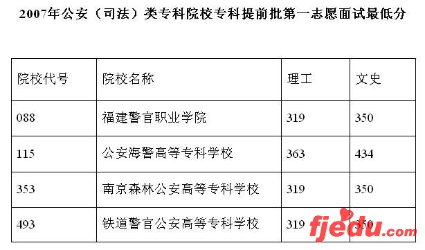 [图文]2007年福建公安司法类专科院校专科提前批第一志愿面试最低分