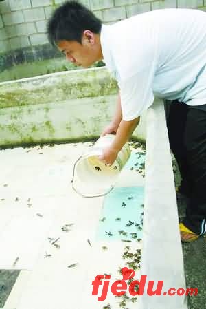 蔡纯进在帮父母养牛蛙。(姚凡 摄)