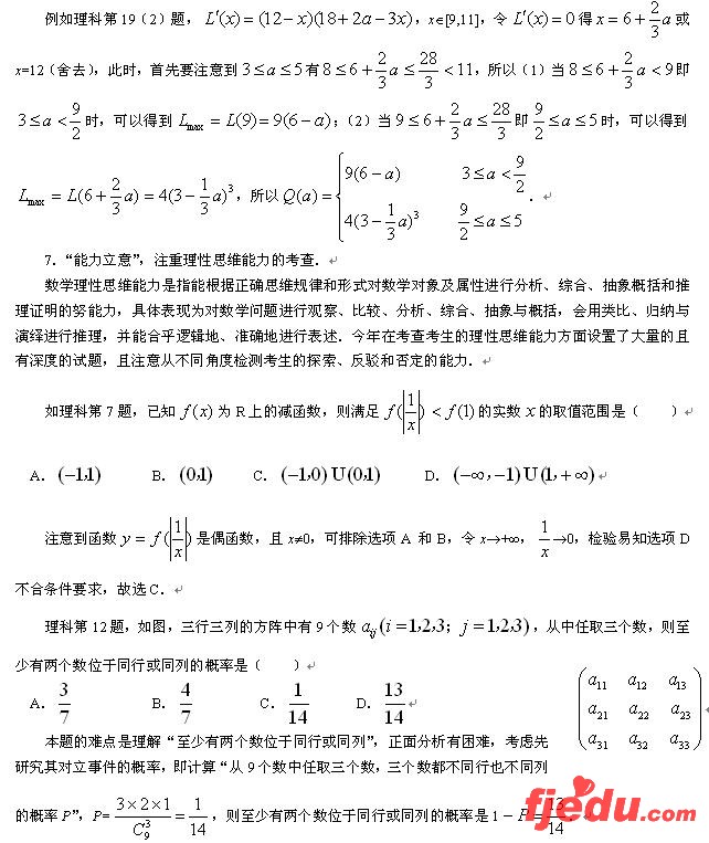 试卷考查函数与导数、数列、不等式、三角函数、直线与圆锥曲线、空间线面关系、概率统计等主干内容的试题在试卷中占有较大比重,充分体现了“重点内容重点考查”的命题思路.如,理科卷中函数与导数知识计有2小2大共36分,且充分发挥导数的工具作用,做较有深度的考查,第11题考查了抽象函数的性质和导数的意义,属选择的把关题;第20题、第22题考查了利用导数研究函数的单调性和求函数的最值问题,结合考查了函数与方程思想、数形结合思想和分类讨论思想,对考生的能力有较高的要求.