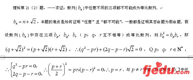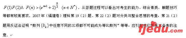 例如理科第12题,以数构成的方阵(矩阵)为背景考查概率知识、考查分类讨论思想,此命题背景相对新颖.理科第16题是一道开放性试题,试题定义了“等价关系”的概念,并给出了“等价关系”的实例,要求考生寻找其它的“等价关系”,本题的立意新,思想性强,能检测出考生在相对陌生的情境中能否灵活应用所学的知识、思想和方法,思维迁移,创造性地解决问题的能力,展示出考生真实的学习水平和能力.第21(2)题和第22(3)题,在设问方式上求“新”,在知识迁移及问题的求解方法上求“变”,能很好考查考生的创新意识和进一步学习的潜能,尤其是第21(2)题,用最平凡的问题考查出考生“不平凡”的能力,是一道优秀的试题.