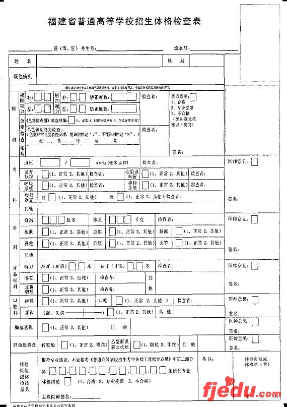 福建高考体检体格检查表