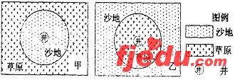 D.乙地由于有水源,以井为中心的地区农牧业活动较多而导致周围地表植被破坏