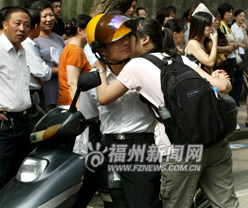 他们是来自福州三中高一(2)班和高一(4)班的同学。“我们今天来这里,一来是想给学哥学姐们鼓鼓劲,加加油;二来是想来提前体验一下高考的气氛。因为再过两年就轮到我们了。”高一(2)班的一位女生告诉记者。