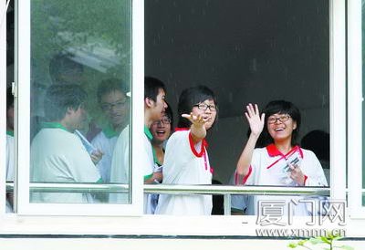 厦门六中考点完成首科考试的考生等待退场,他们看上去很开心。