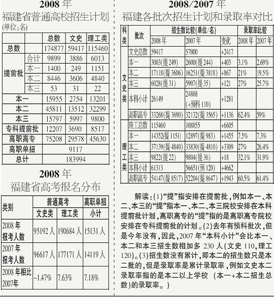 根据福建招生计划册上的统计,今年文史类、理工类和高职单招总招生数为183994名,这个数字并不包括体育、音乐和美术,因为音乐和美术有不少院校的招生计划不分省,无法确切统计出真正的招生计划。