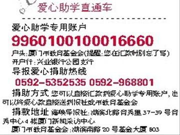 采访许彩敏时,她刚从疯狂英语学习班回家。这是厦门市教育基金会给家庭贫困学生免费提供的学习机会。她说自己的英语不好,这次高考也是英语拖了后腿,接到教育基金会的通知时,她兴奋不已,立即收拾行李赶去学习。