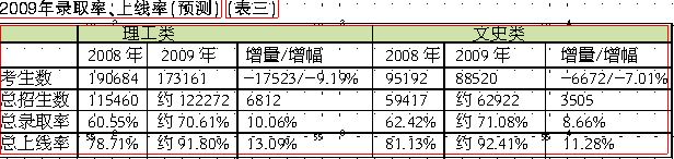 根据以上信息和去年招生计划,不难估算出今年高招总录取率和总上线率。理工类: 2008年总录取率为60.55%,今年约为70.61%,提高10.06%。总上线率为91.8%,提高13.09%。文史类:2008年总录取率为62.42%,今年约为71.08%,提高8.66%。总上线率为92.41%,提高11.28%(见表三)。因此,不论文科还是理科,总上线率都超过90%,都比上年提高10%以上,这是历年高招少有的。