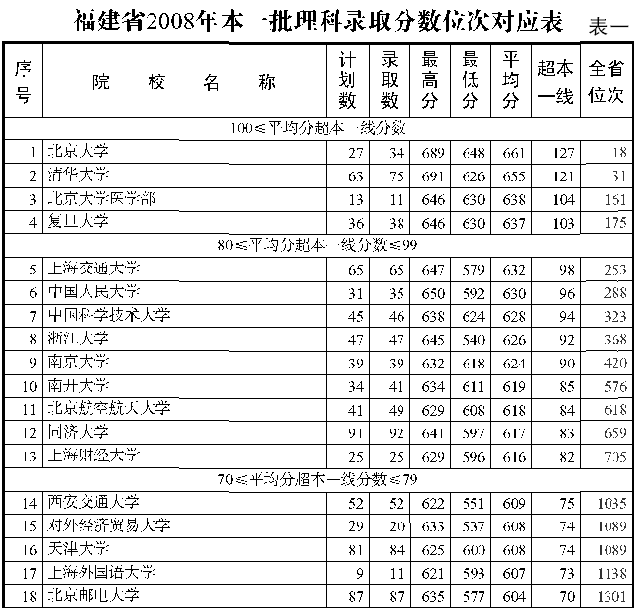 以《2009新编海都高招金手册》本一批录取分数位次对应表(表一)为例,这里的超本一线(即超线分数),特指某一所高校当年录取平均分与当年本一批录取控制分数线之间的“差距”。为什么要引入“超线分数”这个概念?为什么要选择平均分数线而不是最低录取分数线来计算“超线分数”呢?理由有两点: