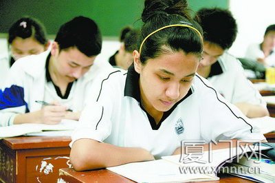 新疆班学生有专门的招生计划。集美中学新疆班的王老师说,今年全国新疆班约有3000名学生参加高考,本科录取率可达87%,专科以上(包括本科)录取率可达90%。图为新疆班学生认真备考。(佘峥 黄嵘 摄影报道)