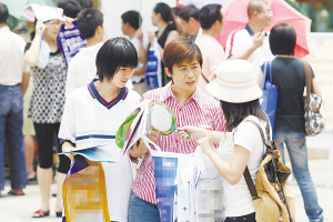 | 补习培训机构的生源争夺战早已白热化。图为高考期间,考生家长在考场外遭遇培训传单“围攻”。常海军 摄 |