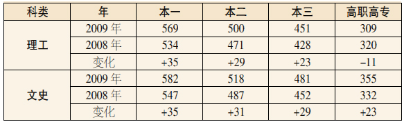 2009/2008福建省高招各批次最低录取控制线比较