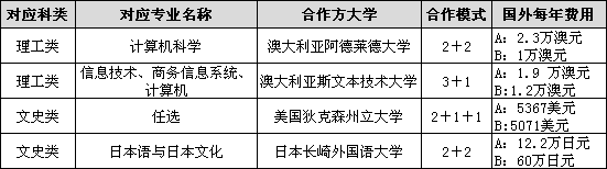 “3+1”模式:该合作项目的基本学制为四年:凡达到该项目入学要求的学生,在大连东软信息学院学习三年,第四年转入国外大学完成后一年的学习。根据两校间的协议,学生修完相应的课程并取得规定学分后,可分别获得大连东软信息学院的本科毕业证书和学士学位证书以及国外合作大学学士学位证书。