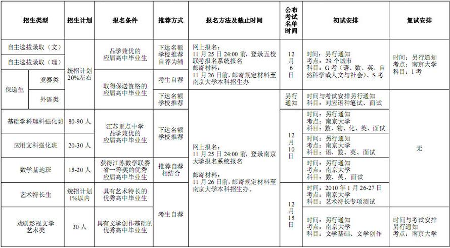 答:南京大学是开展自主招生改革最早、设置招生门类最多的高校之一。2010年自主招生类别有:①自主选拔录取和保送生、②基础学科理科强化班、应用文科强化班和数学基地班、③艺术类专业和艺术特长生。其中基础学科理科强化班、应用文科强化班和数学基地班仅面向江苏省招生。