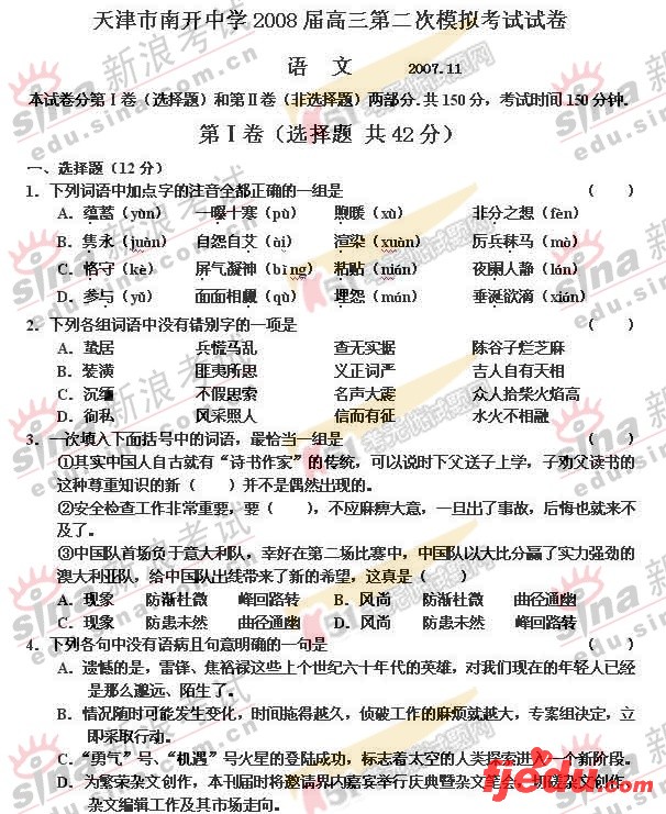 [组图]南开中学2008届高三第二次模拟考试语文试题及答案