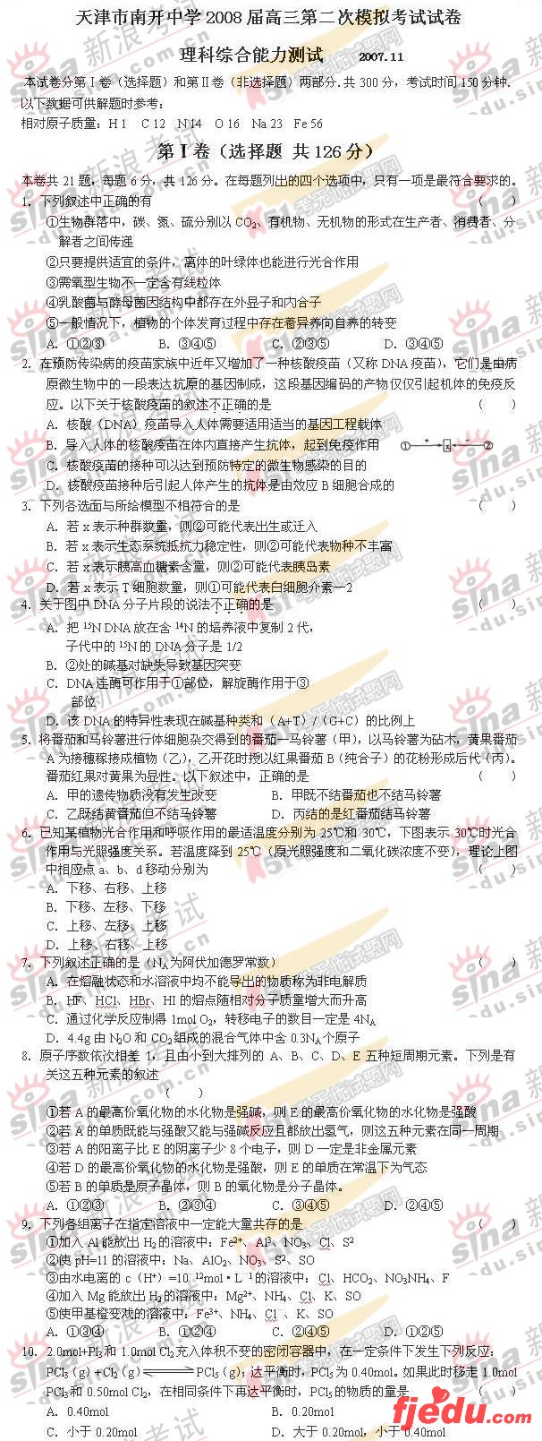 [组图]南开中学2008届高三第二次模拟考试理综试题及答案
