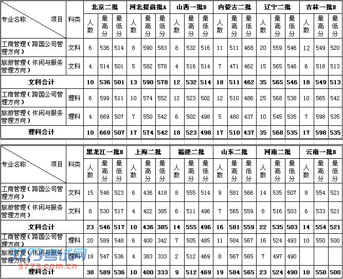 2013年:东北财经大学(萨里国际学院中外合作办学专业)各省分专业录取分数线统计表