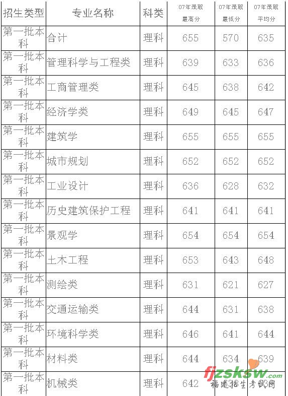 [组图]同济大学福建2007年分专业含艺术类录取分数线