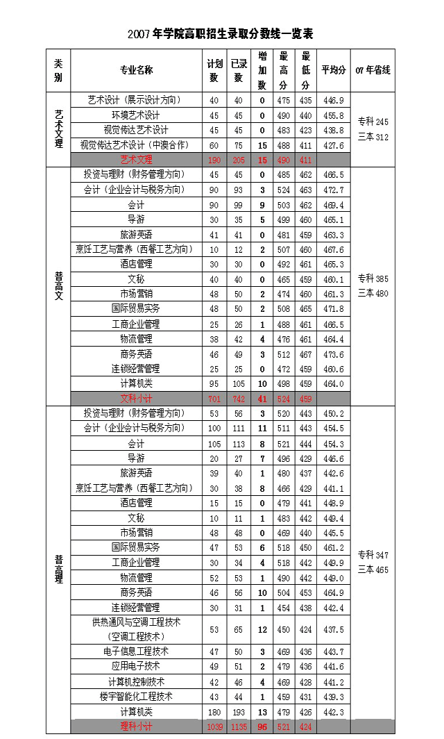 [组图]2007年浙江商业职业技术学院高职招生录取分数线