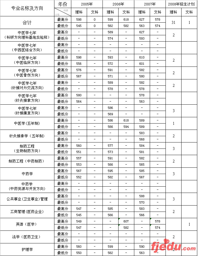 [图文]北京中医药大学2005-2007年福建省分专业录取分数线